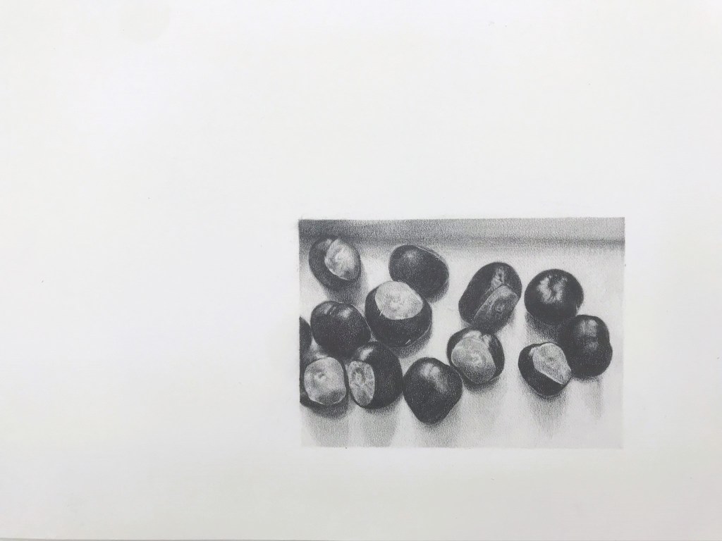 Rest (2019) Super 8 VideoInstall Image from Degree Show at Ulster University 2019Skin and Bones (2019) Graphite on Paper – 32x27cmConkers (2019) Graphite on Paper -32x25cm